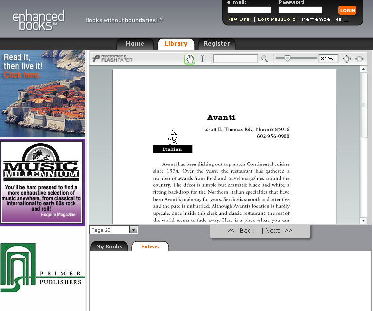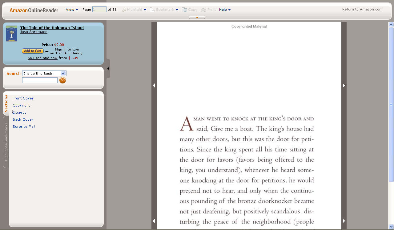 As I have said before I like there features. When you think that in many ways they are the true Book 1.5 company their lack of search is not such a key issue. Readers know that extra features are available simply by buying the book. At the same time why should I need to buy the book to get these features? Should I not just be able to buy the page by page online text? And If I like print it?