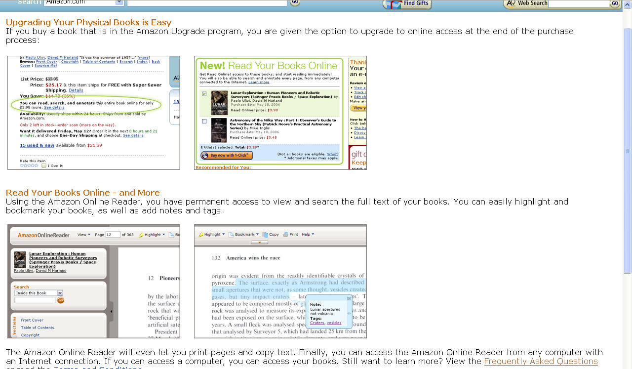 Amazon Upgrade offerings are a step ahead of Google in presentation and slickness. Their readers look good and offer a better reading experience but and here is the key, the Upgrade is for use on book you purchase and Search Inside is for books you have already found. No Google may be getting in trouble with publishers for including books without permission but at least you can search a massive database and find any number of books.