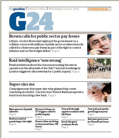 G24 will be a free service featuring news content from the Guardian Unlimited website across five areas: general news, international, economics, sport and media.