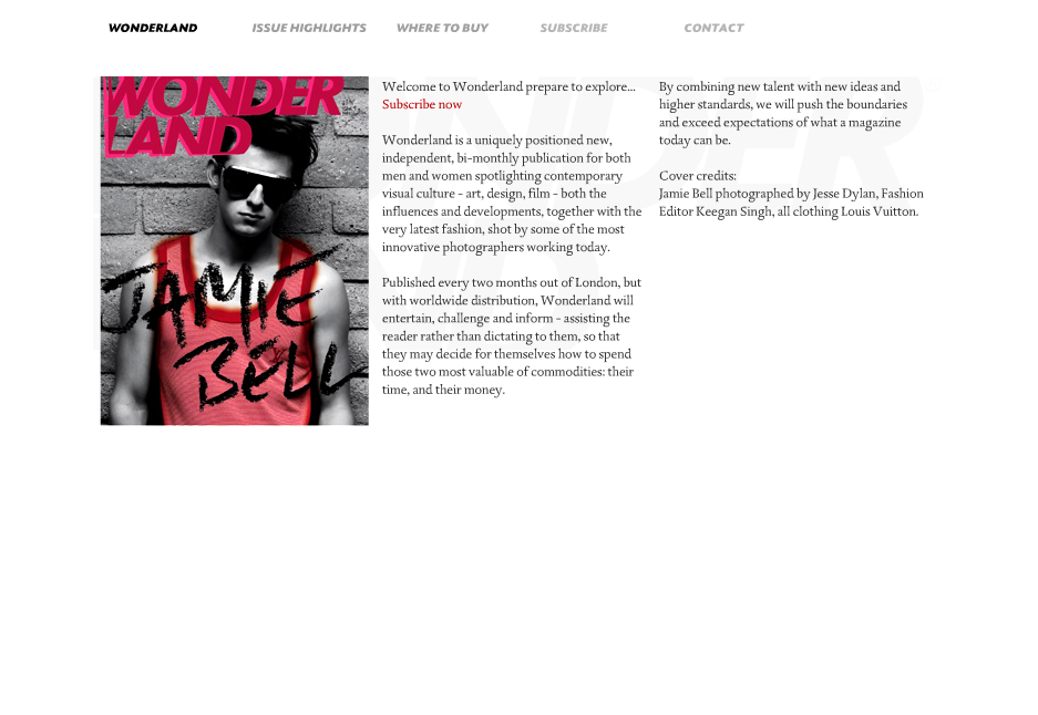 Wonderland is a uniquely positioned, independent, bi-monthly publication for both men and women spotlighting contemporary visual culture – art, design, film – both the influences and the developments, together with the very latest fashion, shot by some of the most innovative photographers working today. Published every two months out of London, but with worldwide distribution, Wonderland will entertain, challenge and inform – assisting the reader rather than dictating to them, so that they may decide for themselves how to spend those two most valuable of commodities: their time, and their money. By combining new talent with new ideas and higher standards, we will push the boundaries and exceed expectations of what a magazine today can be.