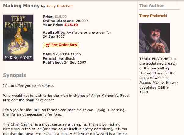 I opened an account at rBooks just to see what it was like. I have mentioned the service before. I inidcated that I was a huge Terry Pratchett fan and when my home-page opened I was offered a massive discount on Making Money his latest book.