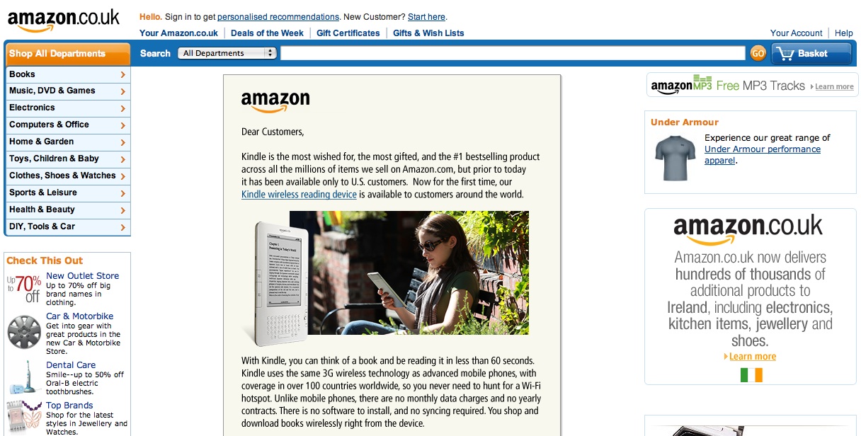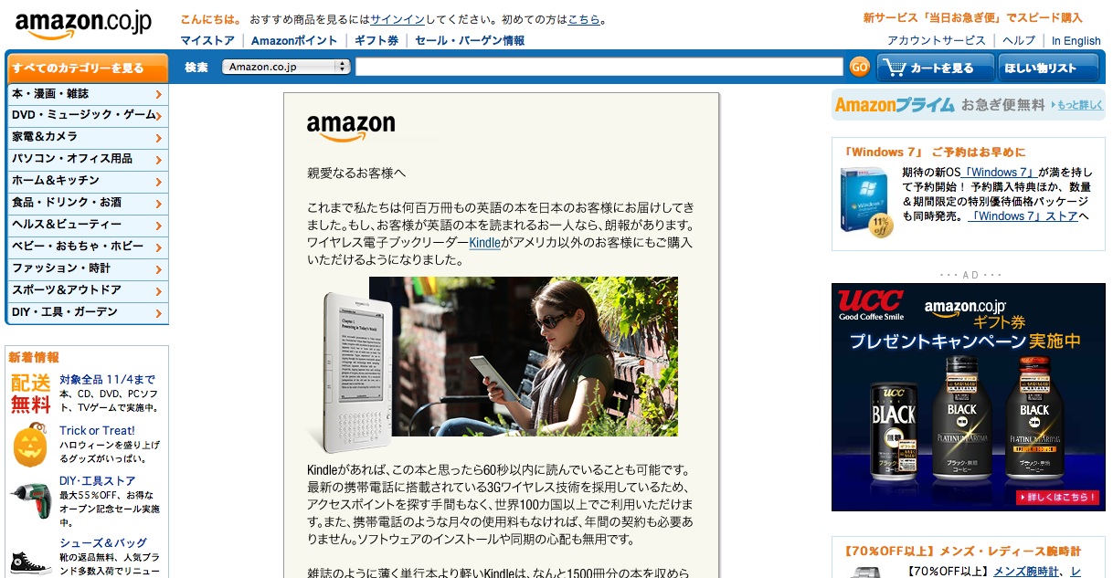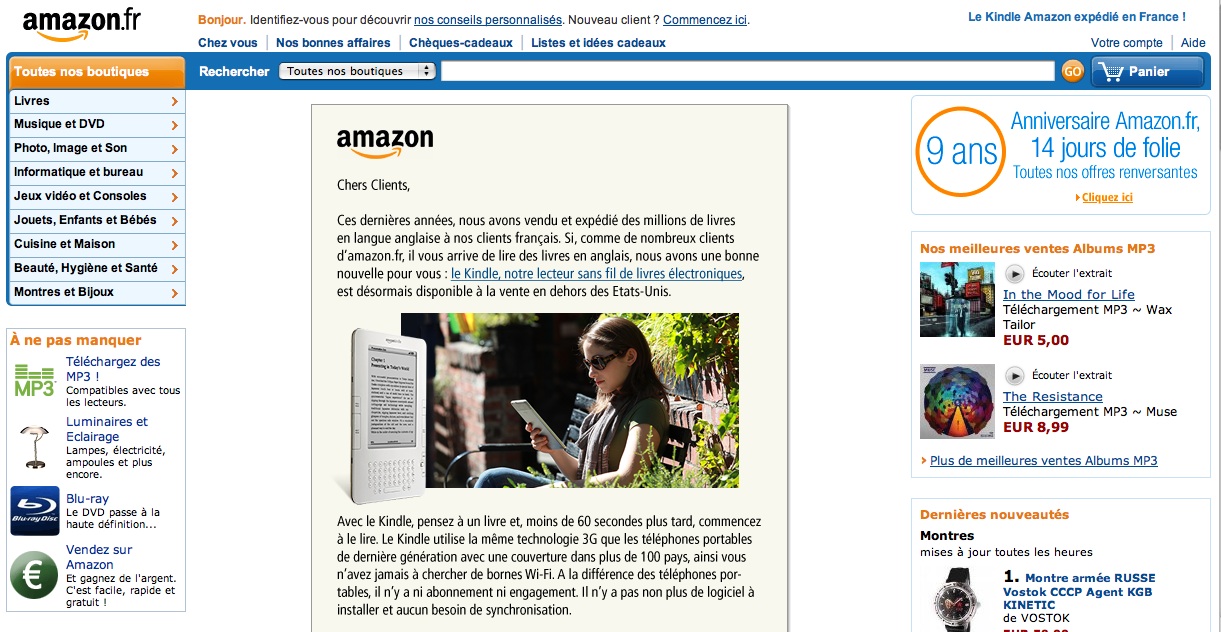 So Amazon announced that they are now allowing pre-orders of the Kindle worldwide. They launched no country specific sites for this, just a letter on the homepage of Amazon.co.uk, Amazon.de, Amazon.fr and Amazon.co.jp. You MUST order from Amazon.com